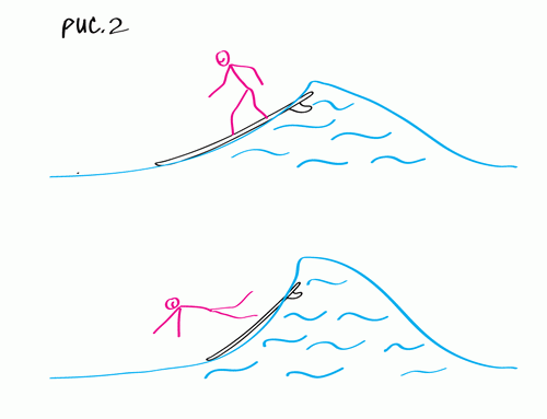 Причем большая доска позволяет не только догонять волны и входить в слайдинг вообще, она позволяет делать это на ранних этапах формирования стенки. Проще говоря вы сможете ехать стоя еще до образования критических профилей волны, склонных к обрушению. Ехать по пологой волне значительно проще и у вас будет больше времени на принятие тех или иных решений. 2:0