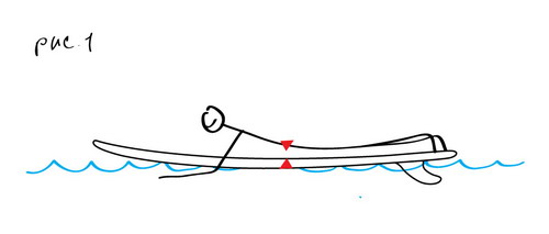 По традиции немного физики. Для того чтобы ваша доска имела наибольшую устойчивость и наименьшее сопротивление движению, вы должны научиться правильно ложиться на доску. Необходимо найти такое место на доске, где проекция  центра тяжести вашего тела совпадает с центром тяжести доски. Проще говоря, ваш условный центр должен совпадать с условным центром доски. Только в этом случае доска будет лежать на воде  плоско, касаясь воды максимальной площадью своей поверхности. Поскольку не бывает 2-х людей с одинаковым строением, а значит и условный центр у всех находиться в разном месте, где-то плюс минус в районе солнечного сплетения. Здесь тот случай, когда этот плюс-минус имеет значение. На доске тоже нет никаких отметок места где находиться центр доски. Поэтому вам надо научиться определять правильное место по положению носа доски, а именно насколько он поднимается над водой. Присмотритесь насколько нос доски поднимается над водой в тот момент когда вас на ней нет. Приблизительно на таком же расстоянии от воды должен находиться нос в тот момент, когда вы на ней лежите. Речь безусловно идет о доске большого размера.