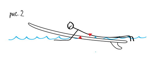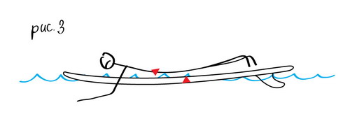 Другая ситуация. Вы лежите на доске и видите, что нос доски касается воды или хуже того тонет. В этом случае, при подходе волны, нос доски зароется в воду и доска вместе с вами перевернется. Итак, если вы лежите слишком сзади — доска никуда не поедет из-за большого сопротивления скольжению. Если вы лежите слишком близко к носу, доска не поедет из-за переворота во фронтальной плоскости. Рис. 1,2,3