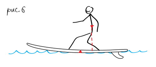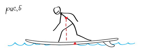 Если вы встали на заднюю часть доски, то к большому сопротивлению добавляется очень значительная неустойчивость. Мало того, доска никуда не едет , так на ней почти всегда невозможно устоять.  У положения стоя есть одно преимущество. Заключается оно в том, что вы всегда сможете поменять свое положение во время движения. К примеру, если вы встали на заднюю часть доски, то простое подшагивание к носу доски позволит вам занять правильное положение. Иногда достаточно перенести вес дела на переднюю ногу и доска начинает ехать веселее. Если вдруг волна стала пологой и необходим дополнительный импульс для разгона, просто наклонитесь вперед. рис 5.